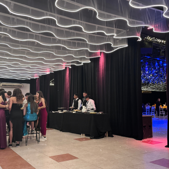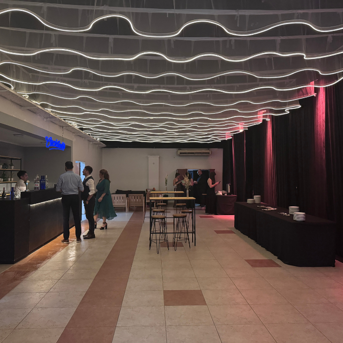 El salón es moderno y amplio, con capacidad adaptable de 50 a 300 invitados, manteniendo siempre una estética cuidada y funcional.